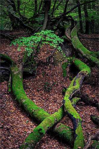 This has been well seen and the composition is nicely arranged. I like how the branches create a lead in that takes us into the image and to the leaves. The lighting and colouring all adds to the effect. The greens in particular are very vivid and I enjoy the carpet of leaves too. |