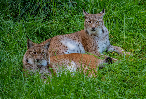 These are no doubt some beautiful creatures and they have been taken in great surroundings. I imagine this was a zoo type environment but there is nothing in the image to show that such as wire mesh etc so well done. Having two subjects, one in each half of an image does divide our attention which is often an issue with even number subjects and this does suffer from that. The front cat is also a little soft compared to his/her compatriot. Havng said that there is no escaping those wonderful stares and well done with retaining all of the detail throughout the contrast range. |