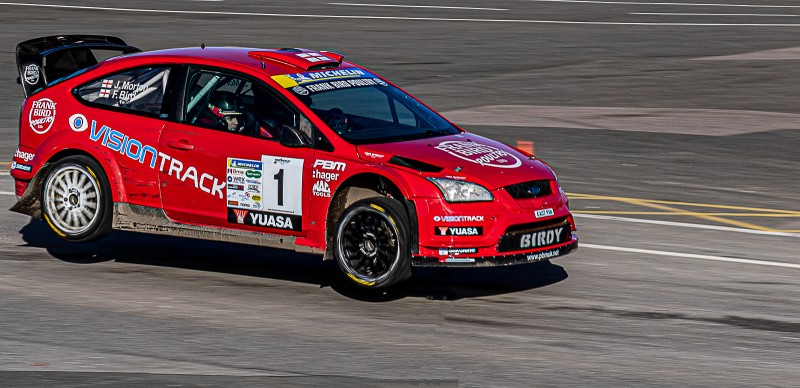 Likes : positon of car – at left and in air. Red on black / grey. Competent panning. Face in window. |