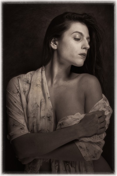 Likes : general feel and atmosphere, mono treatment, soft lighting, slightly toned effect, control of tonalities, pose, hair just separated from background, face appropriately the lightest tonal area. |
