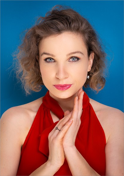 Likes : contrast between red and blue, connection between red lips and red dress. Tonalities very well controlled with face just a little lighter than other skin areas. |