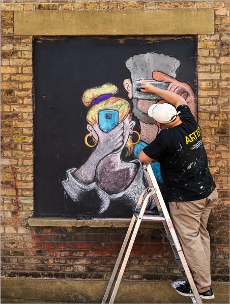This is a nice arrangement with the artist positioned so we can see his image which is in fact two mobile phone photographers. The photographer has correctly for me included the whole of the artist but the ladder has been cropped leaving me wondering how much of it is out of shot. Once again nicely presented with excellent exposure and sharpness. |